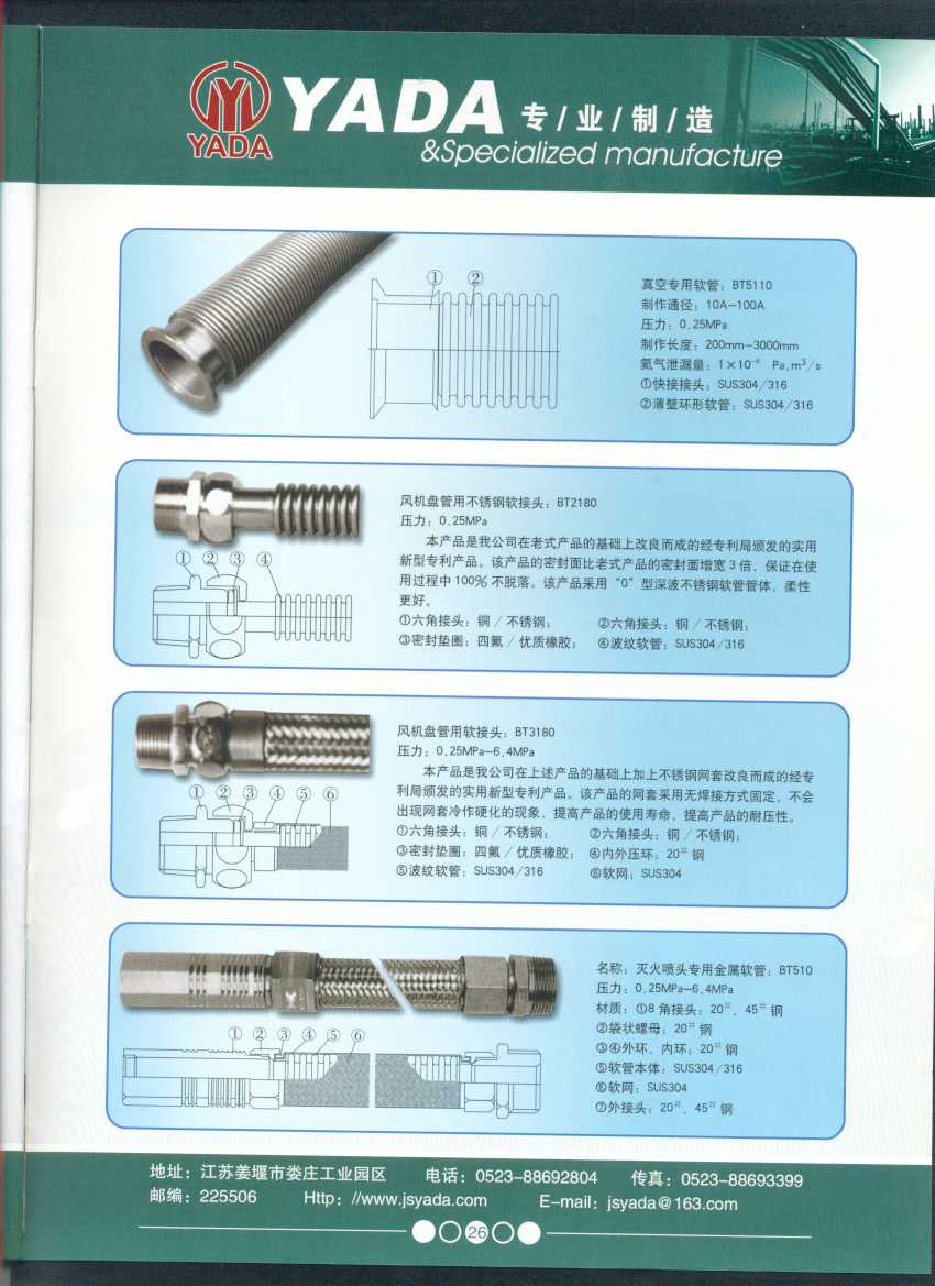 秉天時 籍地利 仰人和 虔誠一個永恒的理念,創(chuàng)新永續(xù).百諾不如一信,亞達(dá)人堅(jiān)持以信為本,視客戶如同上帝,把對信譽(yù)的追求,體現(xiàn)在嚴(yán)格的質(zhì)量控制和完善的客戶服務(wù)上,讓客戶百分之百滿意是亞達(dá)人不變的信念。 本廠系ISO9001質(zhì)量認(rèn)證企業(yè)、計(jì)量合格企業(yè)。本廠專業(yè)致力于生產(chǎn)不銹鋼金屬波紋軟管、超高壓、高壓膠管、波紋管補(bǔ)償器(膨脹節(jié))、立式、臥式、冷卻器。本廠產(chǎn)品具有承受壓力高、彎曲半徑小、抗疲勞性能強(qiáng)、使用壽命長等特點(diǎn)。廣泛應(yīng)用于電力、石化、冶金、水泥建材、工程機(jī)械、礦山及液壓系統(tǒng)。產(chǎn)品暢銷全國各地。 今日亞達(dá)之成功源自諸多客戶的厚愛,明天的輝煌更離不開您對我的支持與信賴。查看更多>>